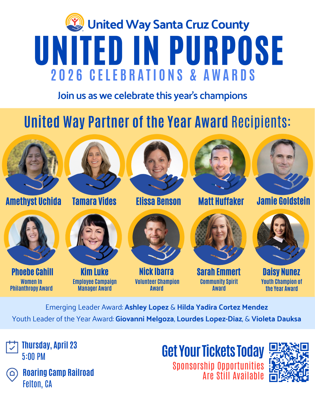 United in Purpose is an evening of celebration honoring the individuals, youth leaders, and organizations whose leadership and service strengthen Santa Cruz County. Set among the redwoods, the night begins with a scenic train ride, followed by dinner with hosted beer and wine, and an awards celebration highlighting inspiring stories of community, resilience, and youth leadership. Together, we gather to recognize the people who show up for our community and help shape a stronger future. Ways to Participate: Support this special evening by becoming a sponsor, purchasing individual tickets or making a donation to this event. Sponsorships help make this celebration possible and support United Way SCC's work to uplift youth, families, and communities. Proceeds from this event support United Way of Santa Cruz County programs serving youth, families, and communities where support is needed most across the county.