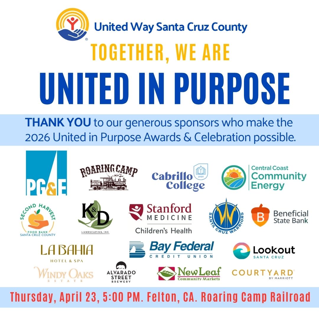 United in Purpose is an evening of celebration honoring the individuals, youth leaders, and organizations whose leadership and service strengthen Santa Cruz County. Set among the redwoods, the night begins with a scenic train ride, followed by dinner with hosted beer and wine, and an awards celebration highlighting inspiring stories of community, resilience, and youth leadership. Together, we gather to recognize the people who show up for our community and help shape a stronger future. Ways to Participate: Support this special evening by becoming a sponsor, purchasing individual tickets or making a donation to this event. Sponsorships help make this celebration possible and support United Way SCC's work to uplift youth, families, and communities. Proceeds from this event support United Way of Santa Cruz County programs serving youth, families, and communities where support is needed most across the county.